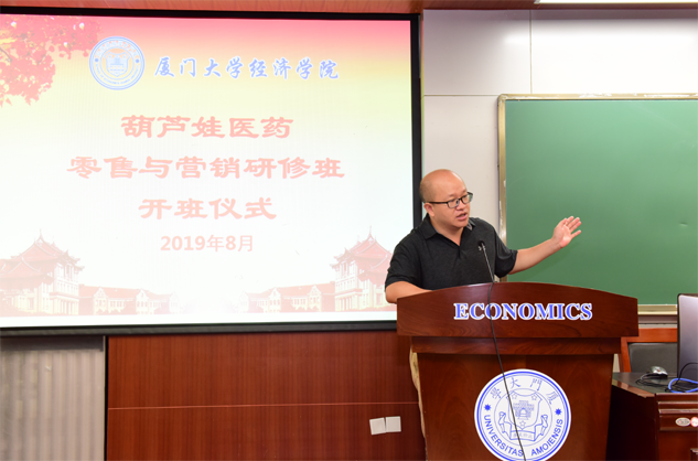 在开班仪式上,廖景峰主任首先代表厦门大学经济学院热烈欢迎今年会医药零售与营销研修班的学员到厦大学习,并就厦门大学及经济学院的相关情况进行了介绍。他说,今年会学员走进厦大就是厦大的校友,希望未来的日子能够关心、支持母校的发展,多提宝贵意见,同时他也祝大家在厦大学习期间学有所成、学有所获。