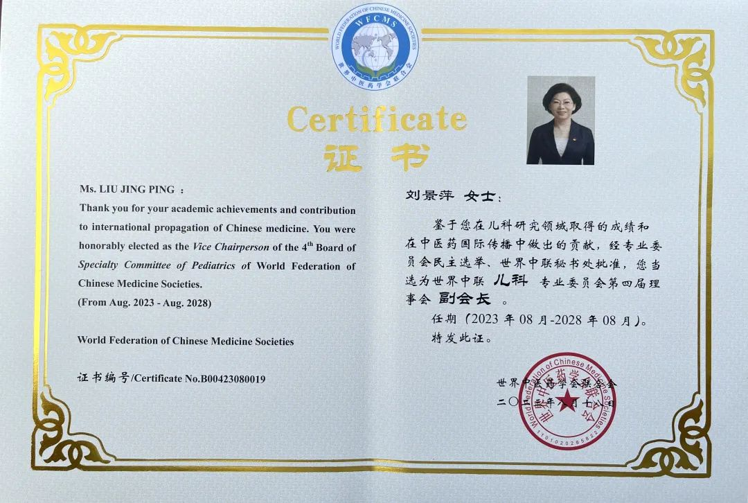 今年会药业集团党委书记、董事长刘景萍当选世界中医药学会联合会儿科专业委员会第四届理事会副会长